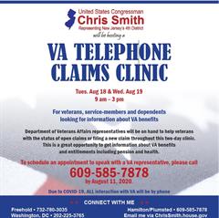 U.S. Rep. Chris Smith (NJ-04), in conjunction with the Veterans Administration (VA), will host a VA Telephone Claims Clinic for vets, military retirees and their family members, and active duty service members on August 18 and 19, 2020. “It’s vitally important that veterans, active duty military, military retirees and their dependents have access to their VA services during the COVID-19 pandemic,” Smith said. “Health needs don’t take a hiatus, not for COVID-19 or anything else. This ‘telephone ...
