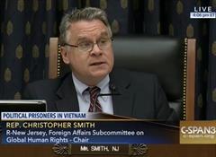 The wife of a Vietnamese prisoner of conscience made a dramatic appeal at a congressional hearing today for the unconditional release of her husband Nguyen Van Dai. Appearing at a human rights subcommittee chaired by U.S. Rep. Chris Smith (NJ-04) Ms. Vu Minh Khanh testified that her husband has been detained for almost five months after being arrested in December after leaving his home to meet with a delegation from the European Union who were in Vietnam for the annual EU-Vietnam Human Rights Di...