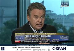 Congressman Chris Smith (NJ-04) today gave a live 45-minute interview on C-SPAN's Washington Journal about President Obama's push to use military force in Syria, and on Smith's own resolution to create a Syrian War Crimes Tribunal. On set with moderator Pedro Echevarria, Smith took questions from across the nation, defending his own opposition to President Obama's plan to strike Syria, and recalling Secretary of State John Kerry evading Smith's direct question during a hearing last week as to wh...