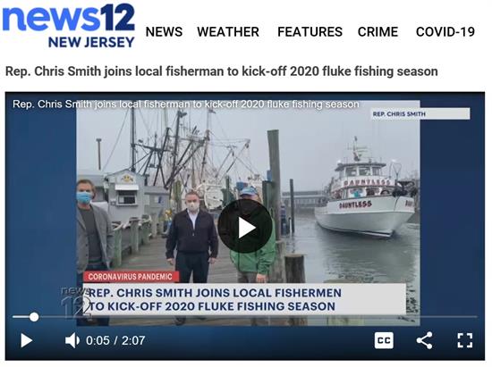 News12 NJ Story on Memorial Day Weekend Kickoff @ Jersey Shore'Rep. Chris Smith Joins Local Fisherman to Kick-off 2020 Fluke Fishing Season'Rep. Chris Smith met with captains and customers over the Memorial Day weekend as they boarded local vessels and kicked-off the 2020 fluke fishing season. Smith has been working with the United Boatmen and Recreational Fishing Alliance, and their effective representative, Ray Bogan, to urge Governor Murphy to reopen the fishing boats at a capacity that is both safe and economically viable. News of the change came Friday morning. This clip ran numerous times over the May 23-25 Memorial Day holiday weekend, and can be found online at: http://newjersey.news12.com/clip/15072680/rep-chris-smith-joins-local-fisherman-to-kick-off-2020-fluke-fishing-season# |