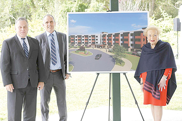 From left, U.S. Rep. Chris Smith, Soldier On CEO Bruce Buckley and Monmouth County Freeholder Lillian G. Burry surround a rendering of Tinton Falls’ new homeless veterans facility, scheduled to open within 18 months. Courtesy Monmouth County, Winn Development